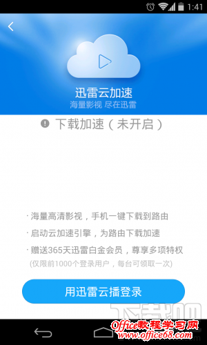二、把迅雷离线空间中的影片下载到小米路由器1.在手机上安装小米路由器APP。 2.选择“应用中心→海量影视迅雷云加速”,点击“用迅雷云播登录”,手机开始下载安装云播App。安装完成后,再次点击“用迅雷云播登录”,登录迅雷账号(去注册),即可将迅雷账号与小米路由器绑定。