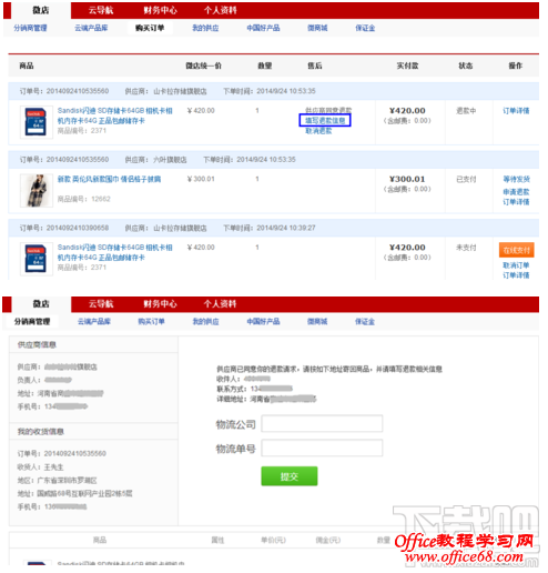 4、供应商回复后,同意退款就退货(供应商的收获信息在订单详细中有,或者直接叫供应商提供),进入【填写退款信息】,【填写退货物流单号】。如果你是直接拒收的话可以直接填供应商发货的单号或填无。 【注意】如果供应商同意退款后超过7天不填写退款信息则会自动取消退款申请,不能再申请。