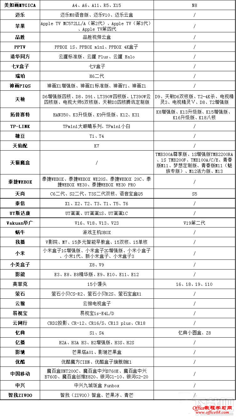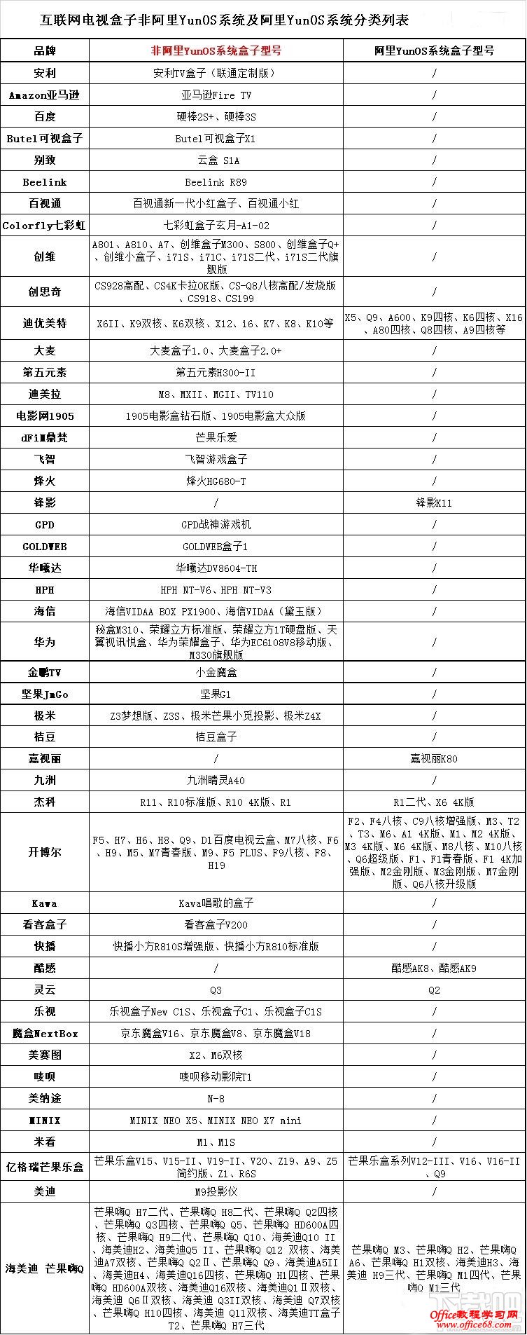 从此表中,咱们可以非常清楚地看到: (1)阿里YunOS系统盒子品牌: 天猫魔盒、酷感、嘉视丽、锋影等 (2)既有YunOS系统又有非YunOS系统盒子品牌: 忆典、英菲克、华广、天敏、天尚、拓普赛特、亿格瑞、开博尔、杰科、灵云等 (3)非阿里YunOS系统盒子品牌: 小米、海美迪、美如画、百度、百视通、创维、创思奇、大麦、迪美拉、1905、华为、九洲、快播、看客、米看、美赛图、迈乐、清华同方、亚马逊、苹果、七V盒子、我播、影能、萤石、运完形、亿播、智我、影驰等大部分品牌是采用安卓系统或者自己开发的系统。 另外可以看出,凡是搭载了阿里YunOS系统的盒子,均受影响。到小编发文为止,安卓盒子还是没受广电禁令影响的 |
