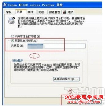 3、在新安装的打印机图标上单击鼠标右键,选择“共享”命令,打开打印机的属性对话框,切换至“共享”选项卡,选择“共享这台打印机”,并在“共享名”输入框中填入需要共享的名称,例如XXXX,单击“确定”按钮即可完成共享的设定。