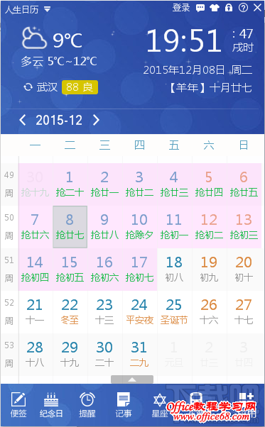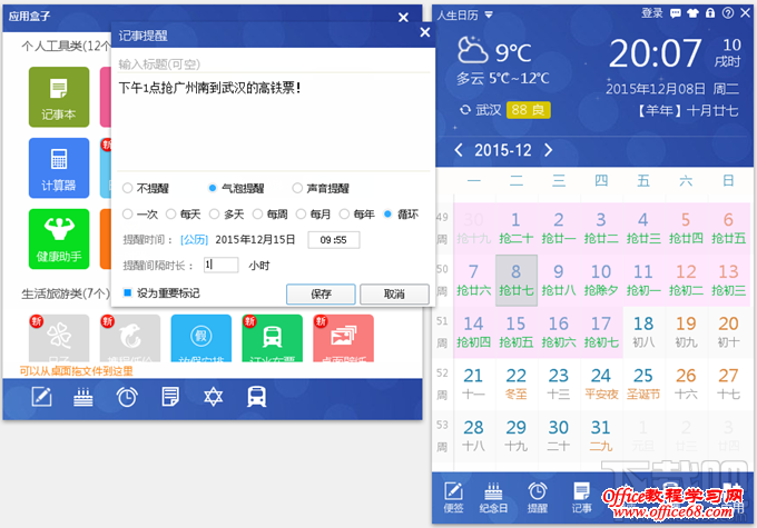 抢返乡票高峰期已快结束,又将要迎来抢返程票高峰期,那么,这时候您就可以用人生日历的记事提醒功能了,提前设置好提醒时间、提醒方式以及提醒次数等。在人生日历主界面右下角的应用里,找到“记事提醒”按钮并打开,新建一个记事提醒,设置好返程票的抢票时间定时提醒即可。