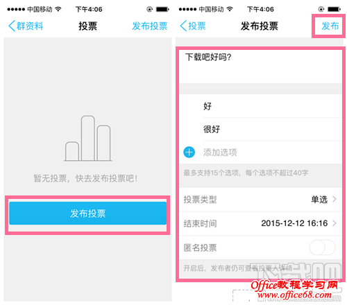 4、进入【群投票】,点击【发布投票】信息编辑页面,编辑完成后,点击【发布】