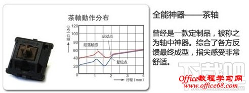 青轴是声音比较大,声音清楚酷似拨片开关,只有当声音响起的时候按键才被触发,因此打字的时候噼里啪啦。 第三种:茶轴 压力克数:60 触发:2.0mm 特点:段落感较钝感 寿命:5000万次