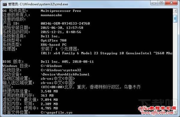 8、在打开的命令提示符窗口键入“systeminfo”,按回车键