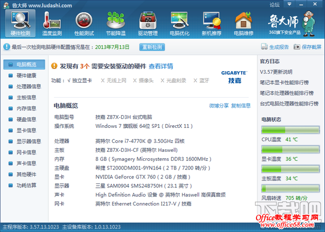 方法二:第三方软件 举例:鲁大师 如果要获得更多电脑配置的详细信息,可以使用鲁大师、AIDA64(专业)等软件查看,还能进行性能测试、电脑稳定性测试等。