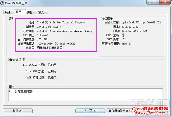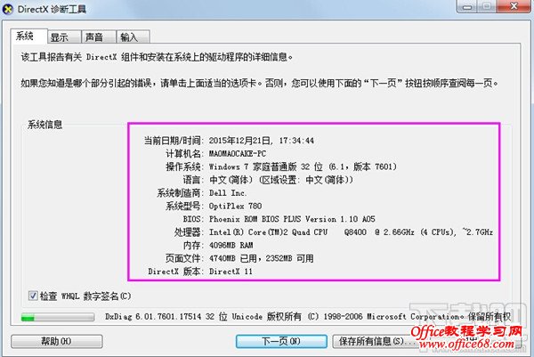 4、打开“DirectX 诊断工具”诊断窗口,在“系统”标签下,在系统信息一栏可以查看到一些基本的信息