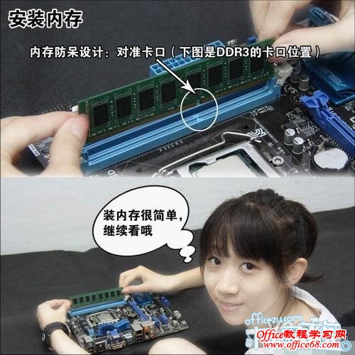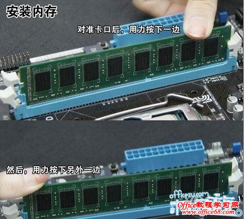 内存的安装很容易,对准内存与内存插槽上得凹凸位,分别左/右用力下,听到“啪”的一小声,左/右卡位会自动口上,然后再用同样方法压好另一边即可。值得注意的是,现在有一些主板,为方便安装显卡,只设置了一个卡位,而安装方法是一样的。 操作步骤