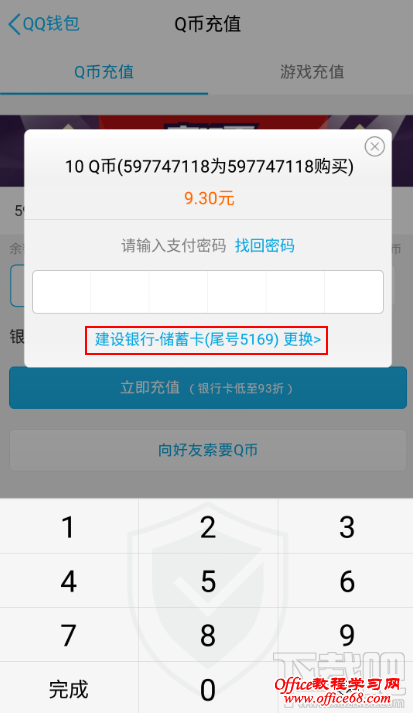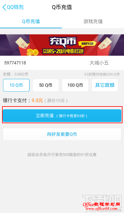 三、选择充值的数额后,点击“立即充值”,有部分用户默认是银行卡支付,这里不用担心,下一步可以设置为qq钱包支付