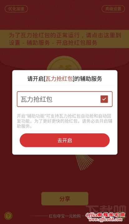 这种直接点开的方法很容易就会被人抢光了。小编这里给大家介绍一种快速轻松抢红包工具。 qq红包怎么抢一、下载安装本文附件“瓦力抢红包” 目前瓦力抢红包支持微信、QQ、支付宝、陌陌四大平台红包。 二、点击“去开启”,打开辅助服务
