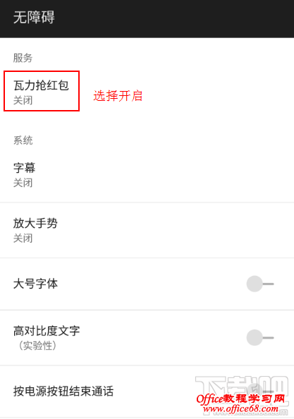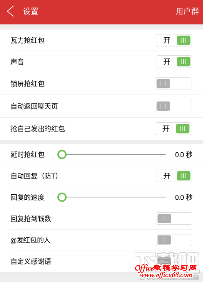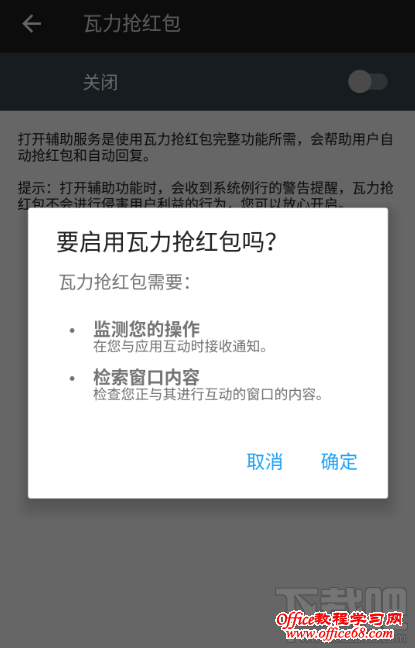 微信抢红包神器使用说明: 第一:要在手机设置里“辅助功能”--开启“瓦力抢红包”服务 第二:微信或QQ要关闭免打扰模式,不要禁用通知,确保能在通知栏上看到消息 现在的瓦力抢红包已经支持锁屏和后台了,并且支持很多自定义的功能,如抢自己发出的红包,延时抢红包,自定义自动回复信息等。