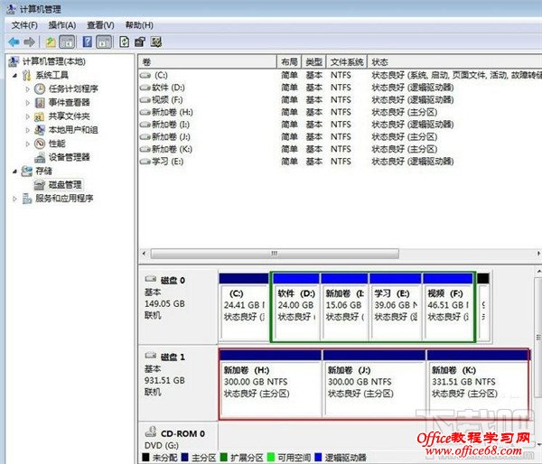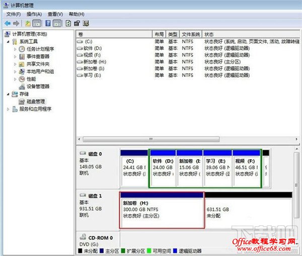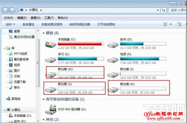 10、最后打开我的电脑,这是就会看到移动硬盘被分为三个分区了;