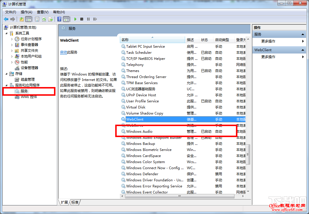 3、在“服务和应用程序”中打开“服务”并且找到“Windows Audio”