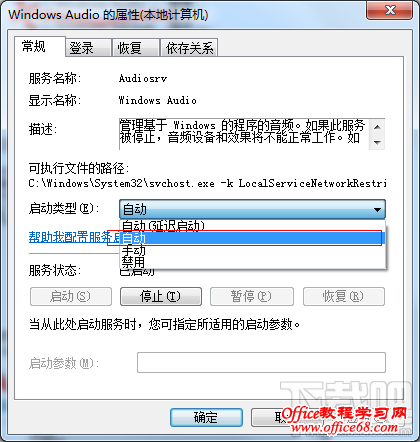 4、右键打开“Windows Audio”属性,在“启动类型”中选择自动;