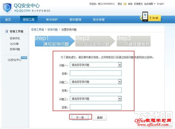 5、现在就可以设置密保问题了;