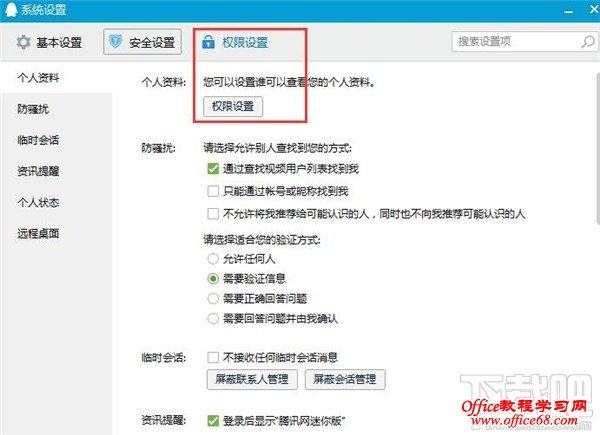 6、如果你不想给别人看到你的资料,你可以去设置-权限设置那么加一道验证,这样别人就没有那么容易看到你的资料了;