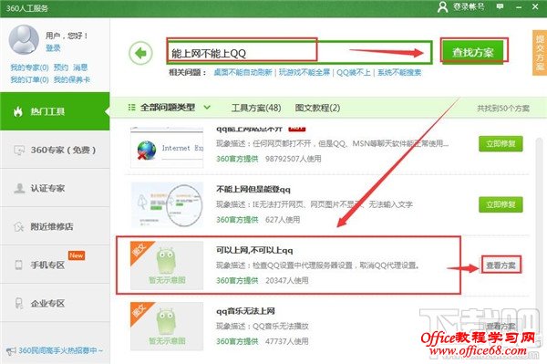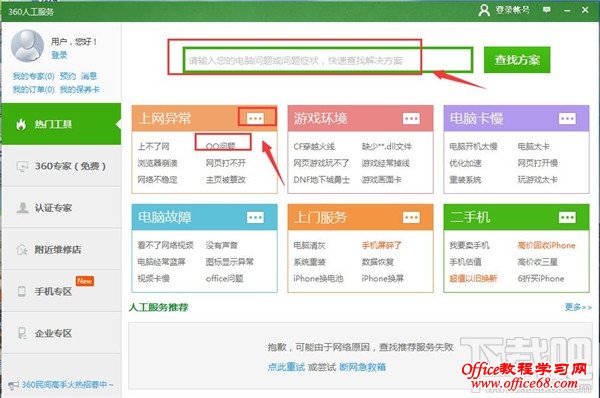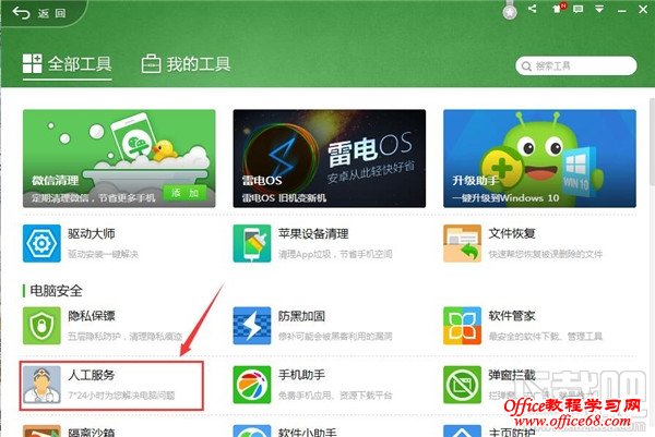 7、使用360安全卫士修复,在全部工具里,找到人工服务,然后把问题搜索一下,出现方案就开始修复;