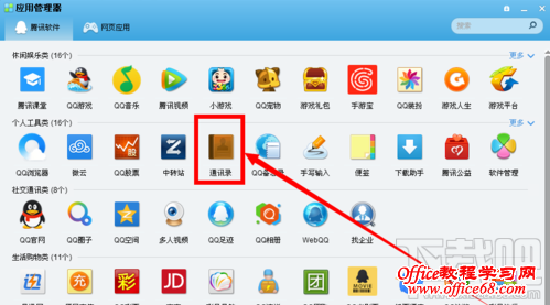 3、在QQ的应用管理界面(QQ主界面板右下角,四个小方框组成的标志),找到“QQ通讯录”的应用图标,点击“添加”到主面板。