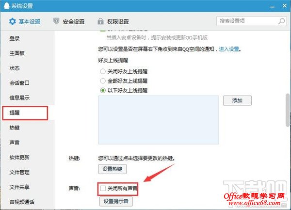 3、这样的话QQ图标就已经隐藏了,为了防止声音出卖你,你可以把声音提醒也关闭掉; 4、进入设置系统对话框,找到提醒项目,把“关闭所有声音”前面的勾打上;