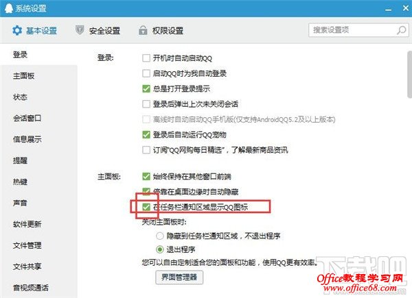 2、进入了之后在基本设置列表,找到“在任务栏通知区域显示QQ图标”,把他前面的勾去掉;