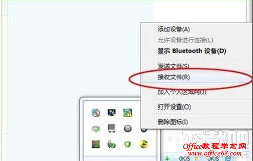 4、你要接受其他设备发过来的文件的那么你需要将蓝牙的接受文件的功能打开,只有这样下能接受文件。右击右下角的蓝牙图标——选择接受文件;