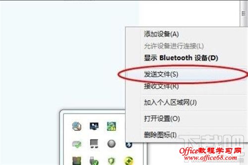 5、如果我们要发送文件的话那么我们必须打开蓝牙的发送文件功能才能进行共发送文件,打开发送文件的功能也很简单,右击右下角的蓝牙图标——选择发送文件——选择发送的设备——选择发送的文件;