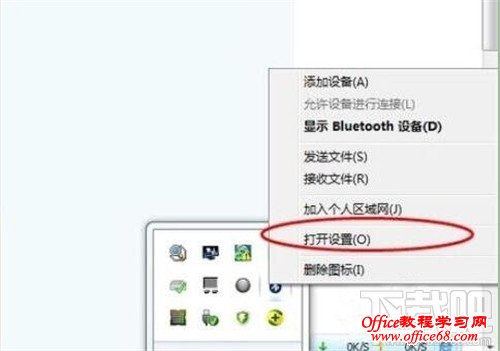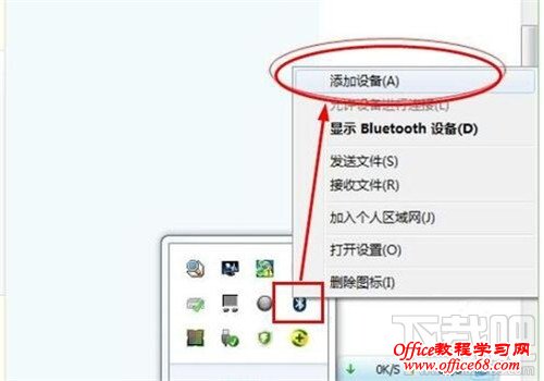 3、这样别人的蓝牙设备就可以检测到你的笔记本电脑了。文件的接受和发送都需要两台电脑连接之后才能进行。蓝牙只有搜索到其他的设备才能使用,所以我们要搜索其他的设备然后连接后在进行通信和文件的共享。搜索蓝牙设备的方法也很简单,右击右下角的蓝牙图标——选在添加设备;