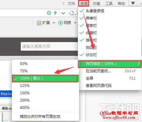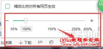 2、还有就是我们可以设置整个网页的比例,把比例放大,这样也可以达到字体变大的效果;具体操作就是一般在右下角有一个100%图标的,你只要点击就可以让你设置其他参数了,或者可以在查看选项,找到网页缩放,然后进行设置也可以;