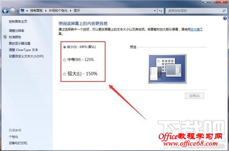 3、还有一种方法就是设置系统的字体大小,因为浏览器的字体大小是跟随系统的,只要系统的字体变大了,浏览器的字体大小自然也会跟着变大了。具体操作如下:如果你的系统是win7,那么你可以直接在桌面右键,进入个性化选项,然后找到左下角的显示按钮,点击就进入了字体大小调整设置;如果你是其他系统,也可以进入控制面板,然后找到字体,设置大小就行了;