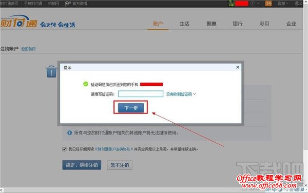 5、【确定、继续注销】后会发一条短信到您财付通绑定的手机号。输入验证码【下一步】;