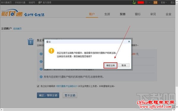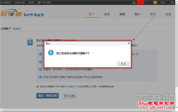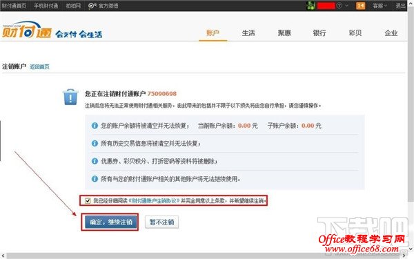 4、确认你要注销财付通账户。注销后账户余额将被清空并无法恢复;所有历史交易记录信息将被清空无法恢复;优惠券、彩贝积分、打折密码等资料将被删除;所有与您的财付通帐户相关的其他账户将无法继续使用。【确定、继续注销】;