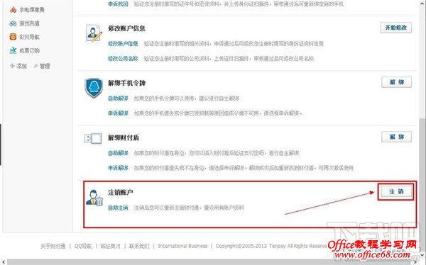 注意:在注销财付时需要选择关闭已开通快捷支付(含一点通)服务后再进行注销。账户余额不能超过10元。 |