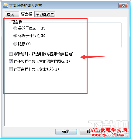 3、如果桌面右下角还未出现换输入法的图标,可以点击“语言栏”,选择停靠于任务栏选项,下面打勾,如图所示: