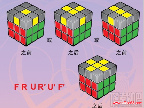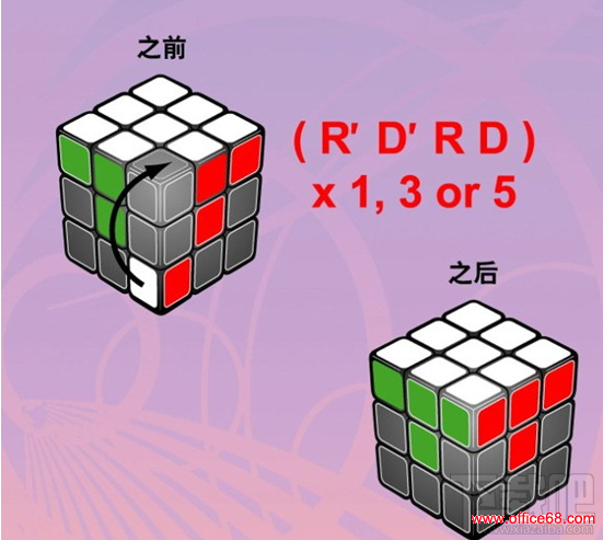 把白色面转向下,找出红绿边块,若红绿边块在顶层则按顺时针方向转动顶层,直到边块与图上的1个情况相同,在按照口诀转动魔方,使边块归位。若红绿边块在中间某层,但位置错误或颜色错误,则先使红绿边块在右前方的位置,再重新按照下面其中一个次序旋转1次。