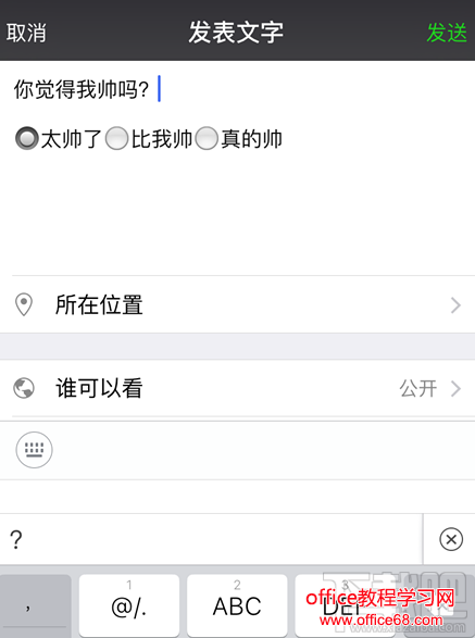 XXX 复制上面的按钮,然后长按朋友圈右上角的“相机”图标,进入文字编辑界面,改成自己的文字就可以了。 细心的小伙伴们会发现,朋友圈选择题选择的图片素材,其实是emoji里面的按钮表情,如果你无法复制朋友圈里好友的内容,那就自己在emoji里面找到按钮表情吧! 微信朋友圈选择题说说编辑教程1、复制朋友圈里“朋友圈按钮选项刷屏”文字(记得把符号一起复制);当然,如果你的朋友圈没有选择题说说的话,可以自己在emoji表情里寻找按钮表情符号。