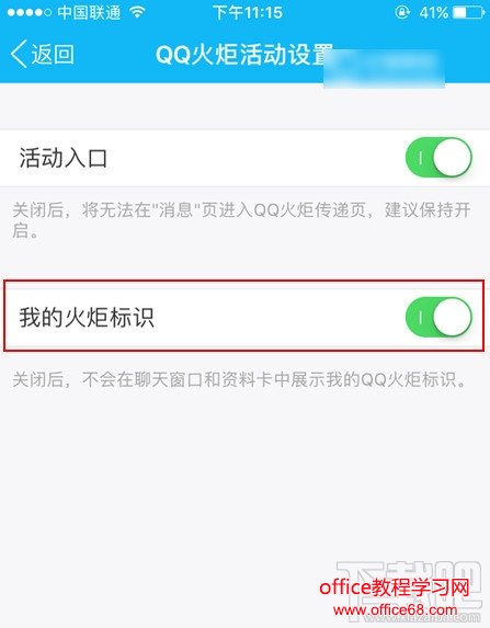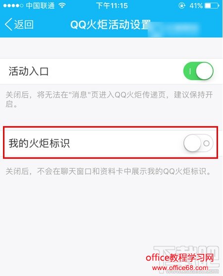 3、在QQ火炬活动设置的最底部找到一项名为“我的火炬标”选项,将其开关关闭就可以了,如下图所示。