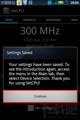 setcpu是什么? setcpu怎么用?setcpu是个设置手机CPU的软件,当然需要 ROOT,下载吧小编就来说说用法 1、下载setcpu后安装 ![]() 2、通过360手机助手连接手机,然后依次单击"装软件,安装本地软件",找到并选择setcpu安装包,单击"打开",稍等片刻,即可安装软件到手机上; ![]() ![]() 3、如果手机上已经安装安全软件,根据需要,确认是否选择开机自动启动。然后找到并单击运行setcpu; ![]() ![]() 4、依次单击"Continue Recommended,OK"之后,会弹出要求授予Root权限的对话框,选择"允许"之后,单击"Continue"(如果手机没有Root,请参考相应文献,将设备Root之后再使用Setcpu); ![]() ![]() ![]() ![]() 5、在"Main"主菜单里,可以直接调节Cpu最高值,即"MHz max",和CPU最低值"MHz min",即时生效。勾选"Set on Boot",即可设置为启动时自动生效; ![]() 6、单击"INFO"标签,可以查询到当前手机的相应硬件信息,如"Memory"等。 ![]() ![]() 注意事项:手机必须已经获取Root权限,否则不能正常使用Setcpu的功能 |