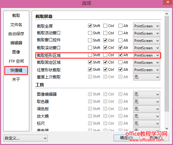 4、快捷键设置:单击PicPick图标——程序选项——快捷键——记忆或修改。例如可以了解到按矩形区域截图快捷键为Alt + PrtSc。