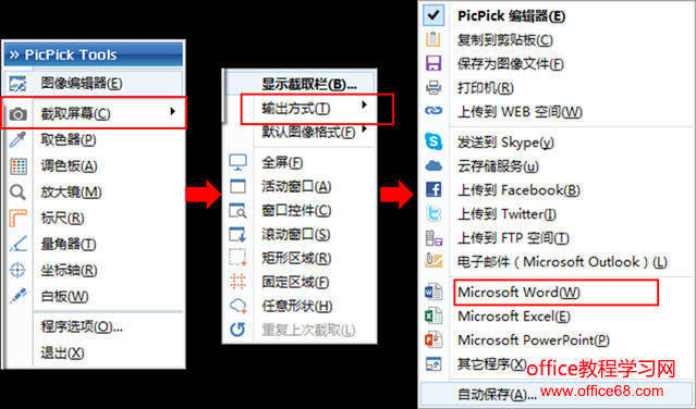 3、设置截图输出方式:单击PicPick图标——选择截取屏幕——输出方式——Microsoft Word。