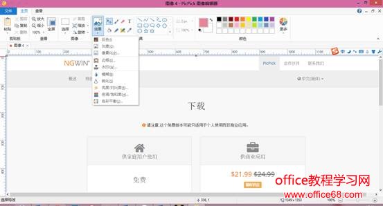 6、 截图后,由于我们将输出方式改成了PicPick编辑器,所以现在进入的是图像编辑界面,在其中,我们可以给图像进行文字添加、形状添加、裁剪等设置,同时还提供图像调整功能:如透明度、模糊、锐化、对比度、饱和度等调整。