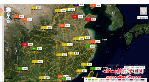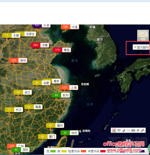 这里上显示了全各地重要城市的雾霾情况,能不同的颜色与数值进行标注!同时可以设置是否显示路网情况!