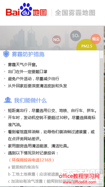 左边提示如何防护雾霾的措施,如何减少雾霾,并对于违法情况进行一些投诉、举报等消息!