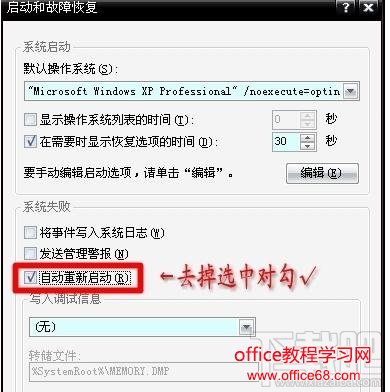 启动和故障恢复→系统失败→去掉 自动重新启动 前的对勾√→确定。
