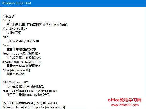 7、命令功能是在参数后面都有介绍其功能和作用。slmgr命令结合这些参考都可以在一起使用。如图: