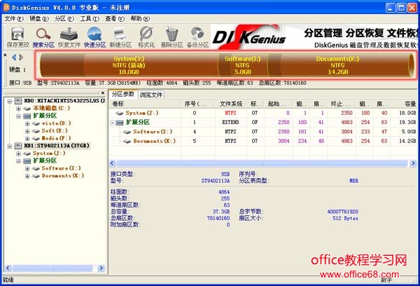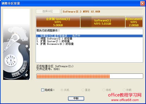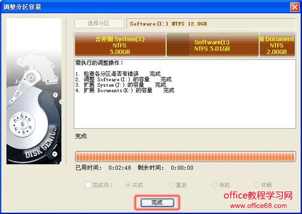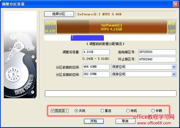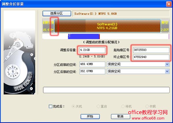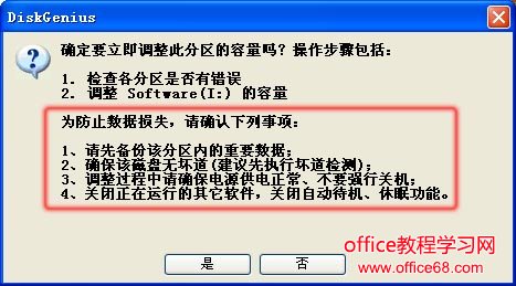 4、 点击“是”按钮,DiskGenius开始进行分区无损调整操作,调整过程中,会详细显示当前操作的信息,如下图: ![]() 5、 调整分区结束后,点击“完成”按钮,关闭调整分区容量对话框,如下图: ![]() 可以看到,磁盘分区的容量已经调整成功!如下图: ![]() 使用DiskGenius进行无损分区调整时,如下一些事项需要注意: 1、 无损分区调整操作,如有涉及到系统分区(通常是C:)时,DiskGenius会自动重启电脑进入DOS模式,并自动运行DiskGenius DOS版来完成无损分区调整工作,分区调整结束后,又会自动重新启动电脑,返回到Windows系统; 2、 调整分区大小时,DiskGenius支持鼠标操作,可以用鼠标改变分区大小,移动分区位置,切换调整后空间的处理选项等;也可以直接指定调整后的分区大小,对于有特殊要求的用户,还可以设置准确的起始与终止扇区号,如下图: ![]() 3、 无损分区调整过程中,请不要使用其他软件对磁盘进行读写操作。事实上,DiskGenius在进行无损分区调整过程中,会自动锁住当前正在调整大小的分区。 4、 当分区比较大,分区上的数据比较多时,无损分区调整过程的用时可能会稍长一些,这时,您可以指定调整后的操作,之后离开电脑,先去处理别的事情,如下图所示: ![]() 5、 当硬盘或分区存在某种错误时,比如磁盘坏道或其它潜在的逻辑错误,或者由于系统异常、突然断电等原因导致调整过程中断时,会造成分区大小调整失败,导致正在调整的分区所有文件全部丢失。因此,无损分区调整是一项有风险的操作。所以,当分区内有重要的文件时,请一定要先做好备份工作,再进行无损分区调整操作! DiskGenius在开始分区调整操作时,也会提示您这一点,如下图: ![]() |