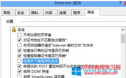 我们都知道下载软件的时候,可使用浏览器自带的下载功能,但在使用Win8系统下载软件的时候,居然出现了错误提示,提示签名无效,很多人都不知道签名是什么,遇到该问题要如何解决呢? 1.首先,在win8系统中打开自带的IE浏览器,之后,在打开的IE浏览器的窗口上方依次点击工具-Internet选项。 2.这样就可以打开IE浏览器的Internet选项窗口了,在弹出来的窗口中,将界面切换到高级这一栏中,然后在下面的设置窗口中找到“检查所下载程序的前面”这一项,然后将该项的勾选去掉,完成设置之后,点击窗口下方的确定按钮保存设置。