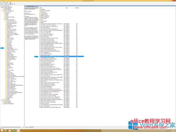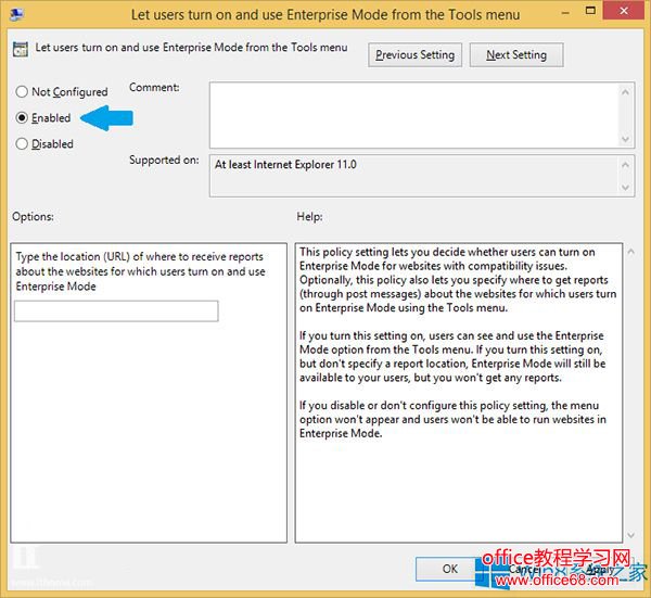 2.依次选中 Computer Configuration -》 Administrative Templates -》 Windows Components -》 Internet Explorer ,双击右侧的 “Let users turn on and use Enterprise Mode”, 选择 “Enabled”(启用)。点击 “Apply” 应用配置。