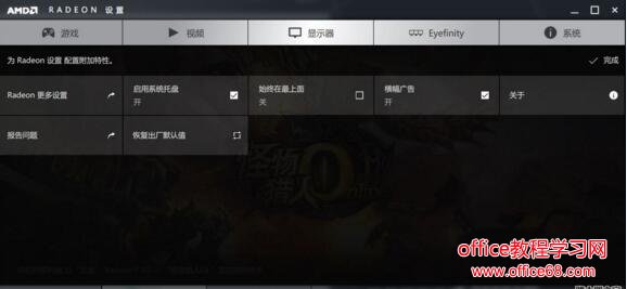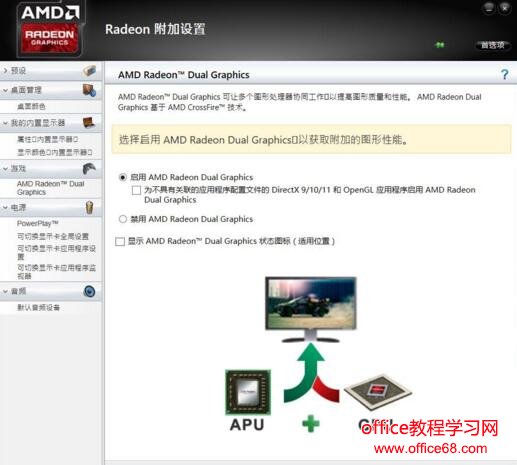 3、点击左上角的“Radeon更多设置”就会弹出传统AMD显卡控制台,在这里面选择“游戏”下面的“AMD Radeon Dual Graphic”选项就可以设置双显卡交火了。