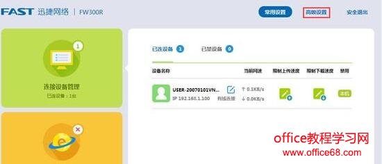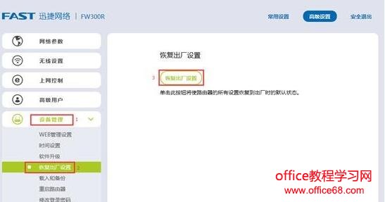 falogin.cn怎么恢复出厂设置?falogin.cn是新一代迅捷路由器登录设置的默认地址,而一般路由器要恢复出厂设置的方法都不外乎两种,按复位键或是在路由器设置界面恢复出厂值。迅捷路恢复出厂设置也有同样的道理,下面我们就来看看falogin.cn恢复出厂设置方法图文教程。 方法一、通过复位键恢复默认出厂设置在使用复位键恢复迅捷路由器出厂设置时,首先我们应该明白复位键是什么。其实复位键就是将路由器一键恢复到默认出厂设置的按键(有的是小孔),位置通常靠近电源接口附近,并标注oss/reset或者WPS/Reset或者default(不同型号可能标注的不同)。 ![]() 具体方法:在路由器接通电源的情况下,一直按住Reset按钮(或使用大头针,圆珠笔尖锐的东西按住小孔)不要松开持续5-10秒;然后观察路由器上的指示灯,当所有指示灯熄灭并全部重新闪烁的时候,松开复位按钮,这样就把迅捷路由器恢复到出厂设置了。 方法二、迅捷路由器设置界面恢复默认出厂值1、打开浏览器,在浏览器地址栏里输入“falogin.cn”,然后按回车键,在弹出的登录框中输入路由器登录密码。 ![]() 2、在路由器设置界面右上侧导航栏里找到并点击“高级配置”,如下图所示: ![]() 3、高级配置页面下,在路由器设置界面左侧导航栏里找到并点击“设备管理”——>“恢复出厂设置”——>“恢复出厂设置”。如下图所示: ![]() 4、然后路由器会自动进行重启,重启完成后,就已经恢复到出厂设置了。 |