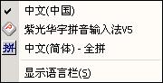 3)用鼠标单击任务栏上的输入法图标,在弹出的列表中选择“中文(简体)-全拼”,调出全拼输入法, 这时屏幕下边出来它的状态条,输入法的小键盘图标变成方块的“拼” 。