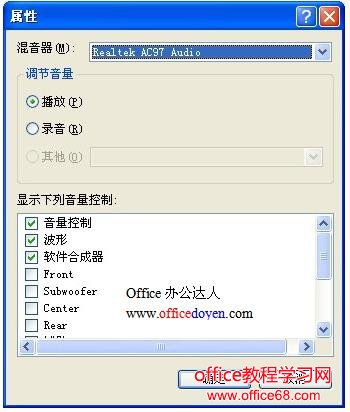 如果对话框中没有这两个选项,请点击“选项”菜单——选择“属性”——在“显示下列音量控制”中选中“音量控制”和“波形”两项,再进行正确设定。
